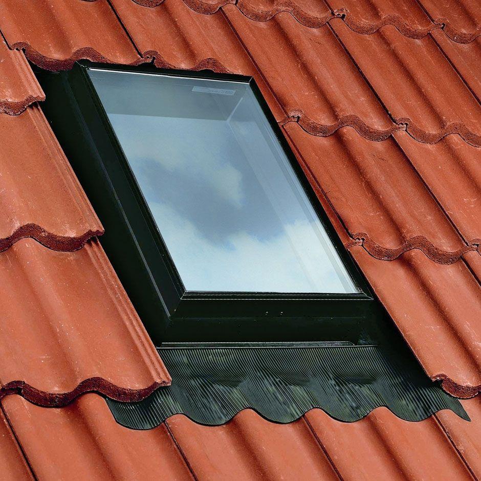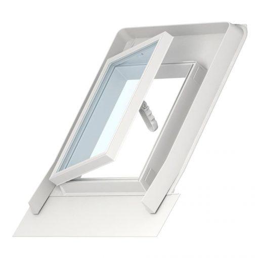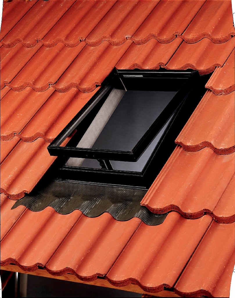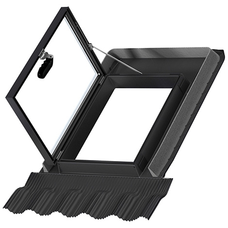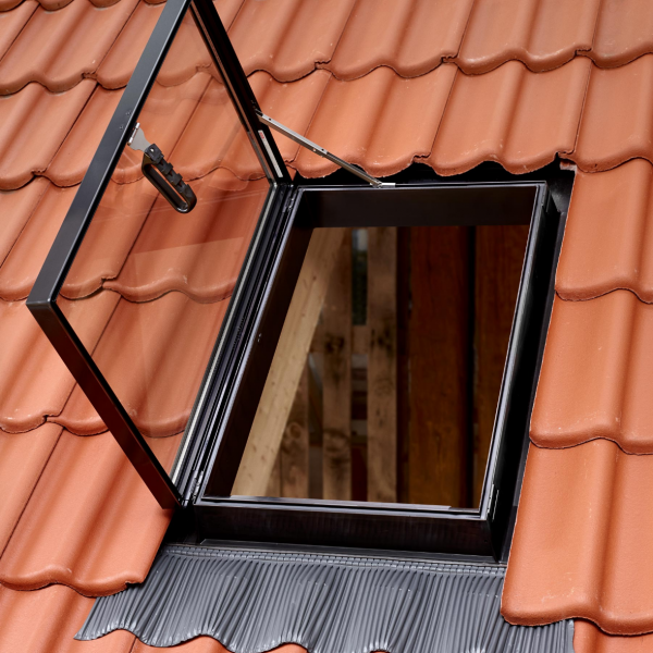 Модель Velux GVT поставляется в полной комплектации — с уже встроенным универсальным окладом, который подходит для большинства кровельных материалов с высотой волны до 60 мм. Это упрощает монтаж и делает изделие совместимым с металлопрофилем, черепицей и другими покрытиями. Створка открывается на 90° по выбранной боковой оси, что обеспечивает удобство эксплуатации и предотвращает повреждение при контакте с кровельными элементами.