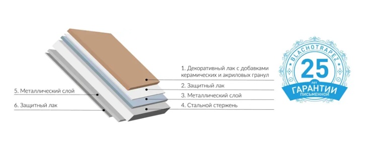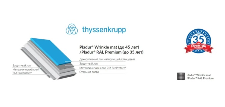 Крупнозернистая, с цветами в соответствии с известными стандартами, двухслойная система покрытия, толщина покрытия мин. 25 микрон. Листы соответствуют требованиям класса A2 в соответствии с Решением Комиссии 96/603 / EC в области противопожарной защиты и могут использоваться в категории коррозионной активности C4 в соответствии с EN ISO 12944-2. Это покрытие имеет до 35 лет гарантии.