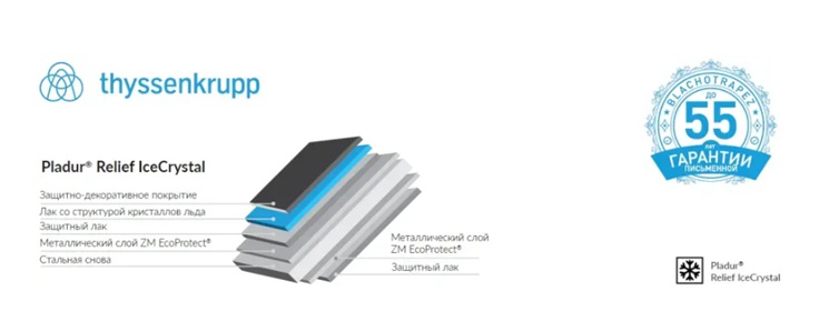 Крупнозернистая, с цветами в соответствии с известными стандартами, двухслойная система покрытия, толщина покрытия мин. 35 микрон. Листы соответствуют требованиям класса A2 в соответствии с Решением Комиссии 96/603 / EC в области противопожарной защиты и могут использоваться в категории коррозионной активности C4 в соответствии с EN ISO 12944-2. Это покрытие имеет до 45 лет гарантии.