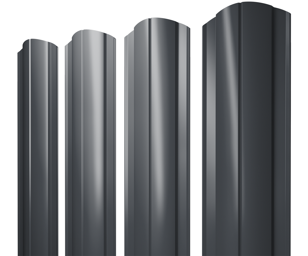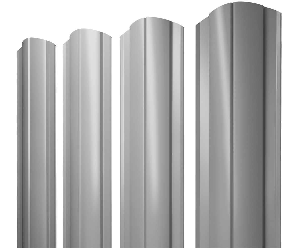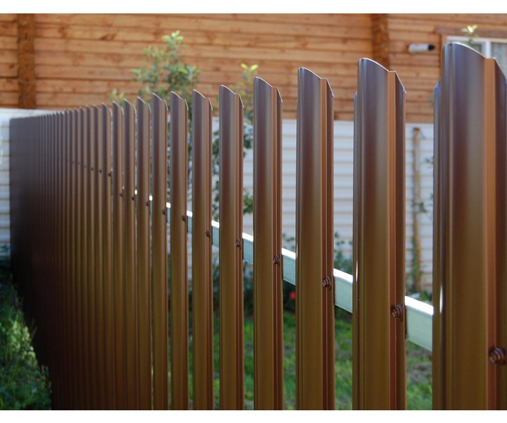 Металлический штакетник — это тип ограждения, состоящий из металлических панелей шириной 80-130 мм с различными вариантами профиля. Круглый фигурный штакетник отличается выпуклой формой. Высота планок варьируется от 500 мм до 3500 мм, шаг панелей — 100 мм, ширина профиля — 128 мм. Изготавливается из оцинкованной стали с полимерным покрытием, толщина листа может достигать 0,5 мм. Цинк и полимерное покрытие защищают металл от агрессивного воздействия внешней среды. Для своего участка можно выбрать металлическое ограждение в любом покрытии и широкой палитре оттенков. Такое ограждение визуально легкое, продуваемое, не обладает парусностью, оставляет участок частично открытым, но при этом максимально защищенным.